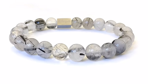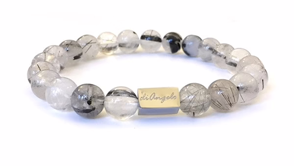 Natural Black Rutilated Quartz Bracelet, beads with a diameter of 9 mm, combined with 1 scratch free stainless steel logo bead.