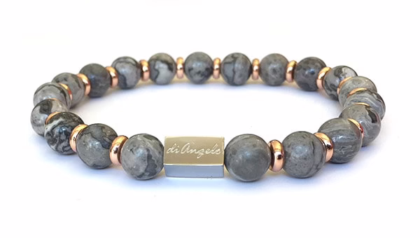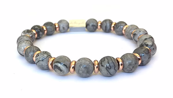 Natural Gemstone Grey Map Jasper & Copper Spacers Bracelet beads with a diameter of 8 mm, combined with 1 scratch free stainless steel logo bead.