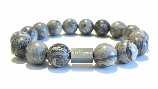 Natural Gemstone Grey Map Jasper Bracelet beads with a diameter of 12 mm, combined with 1 scratch free stainless steel logo bead.