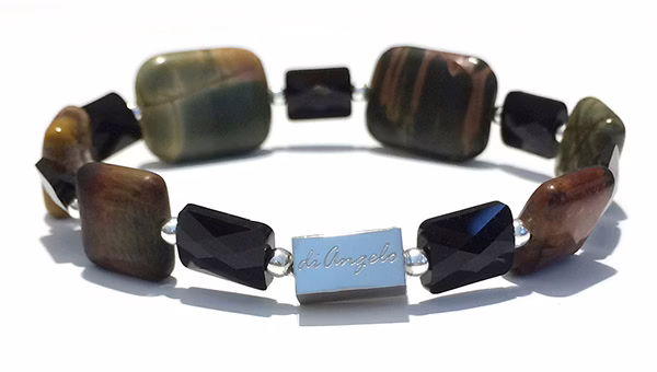 Picasso Jasper + Black Swarovski Bracelet, beads 12 x 12 mm + 15 x 20 mm + Black Swarovski 10 x 8 mm + 3mm round Silver beads, combined with 1 scratch free stainless steel logo bead.