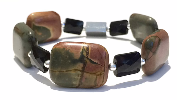 Picasso Jasper + Black Swarovski Bracelet, beads 15 x 20 mm + Black Swarovski 10 x 8 mm + 3mm round Silver beads, combined with 1 scratch free stainless steel logo bead.